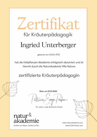 - zertifizierte Kräuterpädagogin, Naturakademie Wien, Dr. Patricia Purker
